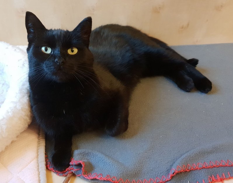 Helsvart, har noen få hår med hvitt i brystet. Kastrert uten chip