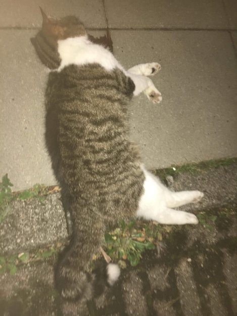 Fant katten 21:00 utenfor blokken i Solåsveien 5. Katten har gjerne blitt påkjørt og var kald når jeg fant den, så den har trolig ligget der en stund. Jeg har informert utleier av blokken om dette. Kondolerer så mye til eier(ene).
