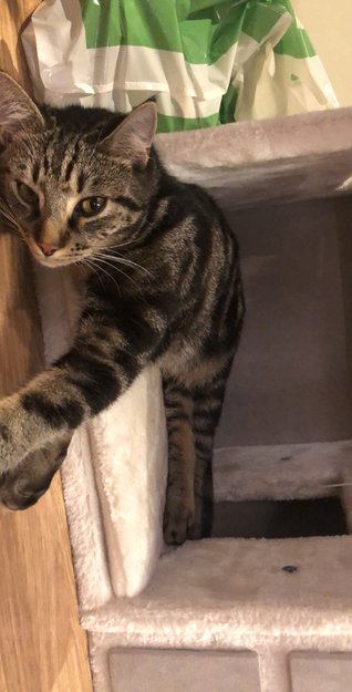 Han er barbert på venstre bakben, har striper, sirkel på midten av magen på begge sidene, han har en grønn «tatovering» i øret hvor det står at han er ID shipet, han er glad i mennesker og mjauer mye.