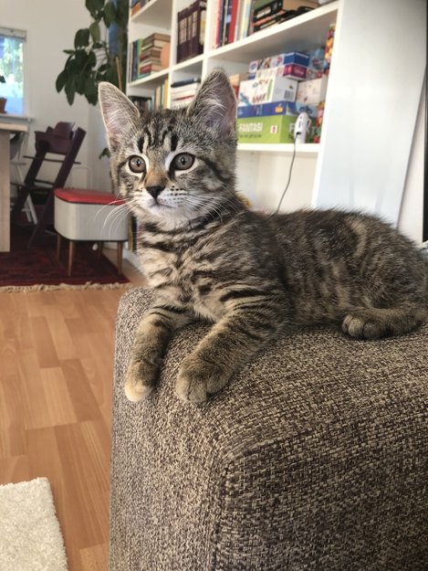 Hun er en liten katt på 6 mnd og går under navnet my. Hun har sort nese og sorte lepper tre sorte poter(under) og en som skiller seg ut og er mer gråbrun under.