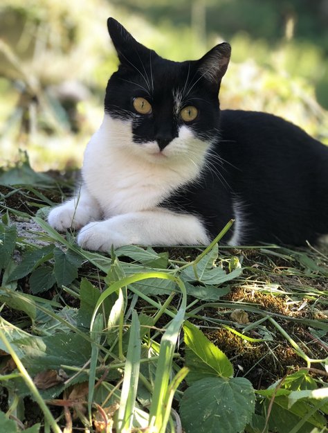 Har en hvit flekk ved venstre øyet. Litt hvitt på tuppene av ørene. Svart rygg/hale(og litt svart på magen) og hvit mage/poter/hals.