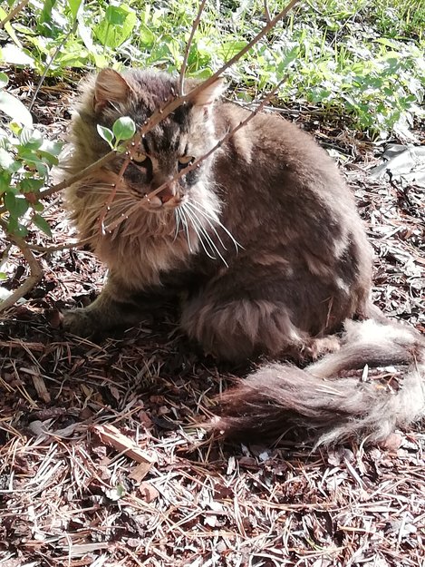Lyder navnet sitt, M mønsteret i pannen, litt løve manke, kroppen har kortere pels enn beina, hodet og halen. Litt skeptisk til ukjente, glad i vanlig mat. Heller vanlig bondekost fremfor sitt spesialfòr for pelsen sin. Elsker kos og nærhet. Mindre glad i små barn..❤️❤️❤️