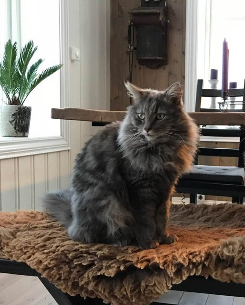 Herrigud er 4 år gammel hannkatt. Langhåret og gråmelert i pelsen. Han er en skipskatt, så det vil si at han har seks klør, pr. pote. Han er en rolig og tillitsfull katt som er kosete.