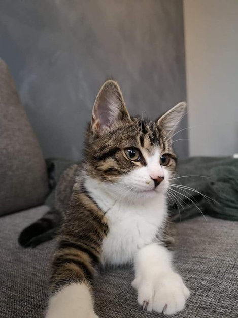 ca 5 mnd gammel katt med grå og svart pels med hvite labber.