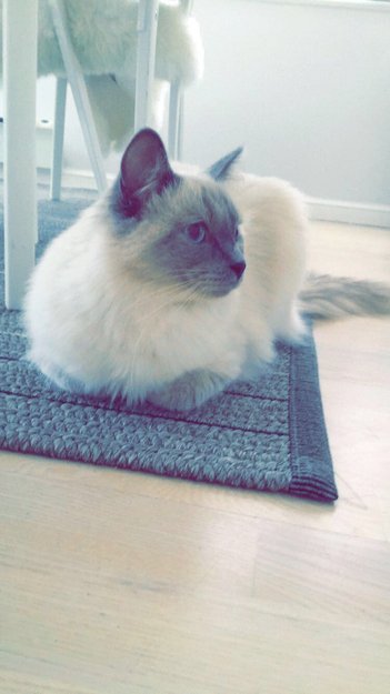 Lussi er lys/hvit, men med mørkere ben, ansikt og ører. Hun har blå øyne.