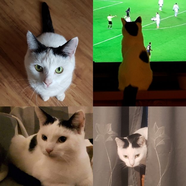 Lotta er hvit, med svart på ørene, en svart flekk på høyre side av kroppen og svart hale.