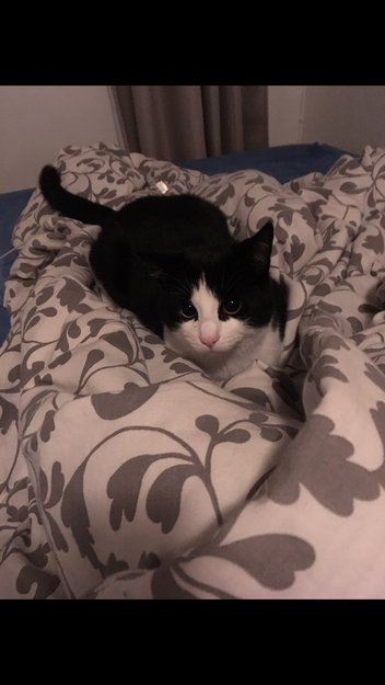 Sort på ryggen og maske . Hvit under . Lett liten katt ca 4 kilo .