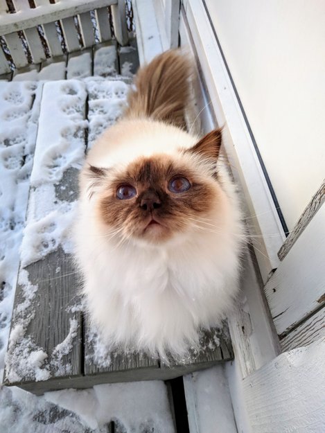 Hvit lang håret jente pus, brun i fjeset og halen og hvit på resten.