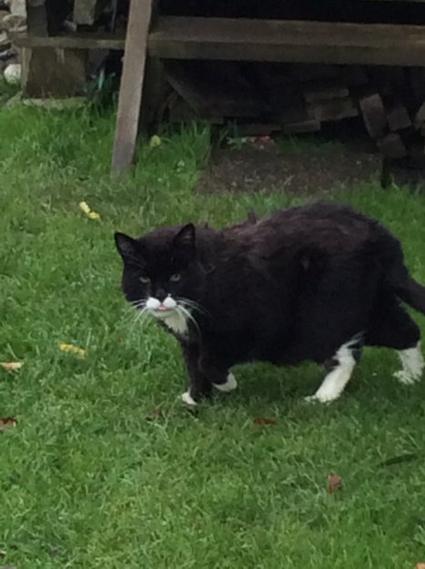 Ganske stor katt, muligens hannkatt. Mest svart, korthåret med markerte, hvite tegninger.
