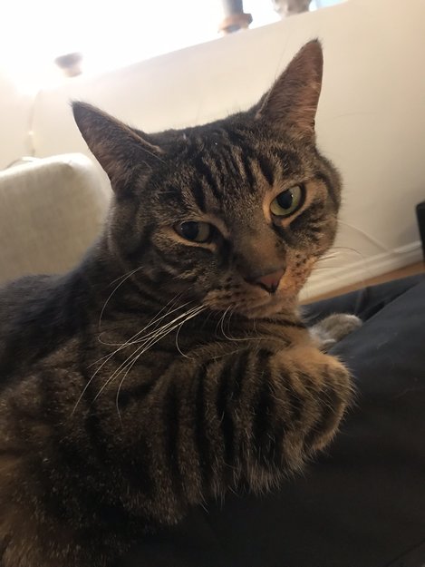 Ganske stor hannkatt, 5-6 kg. Har en hvit flekk midt på brystet.