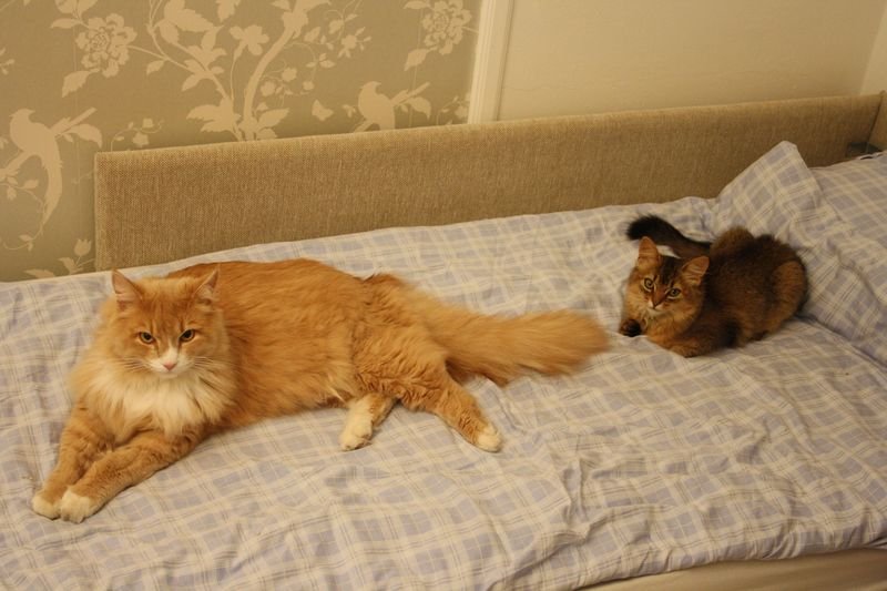 Han kom hjem helt på egen hånd - i full spurt mot mat fatet :-) Isis (den lille i bildet) vasket han fornøyd mens han spiste.