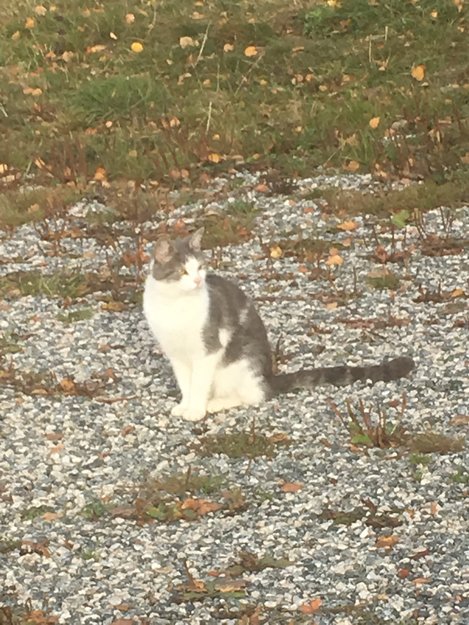 Denne grå og hvite hunnkatten dukket opp hos meg. Sammen med en annen som er sort med hvit flekk på brystet. Ser ut som søsken egentlig. Ser unge ut.