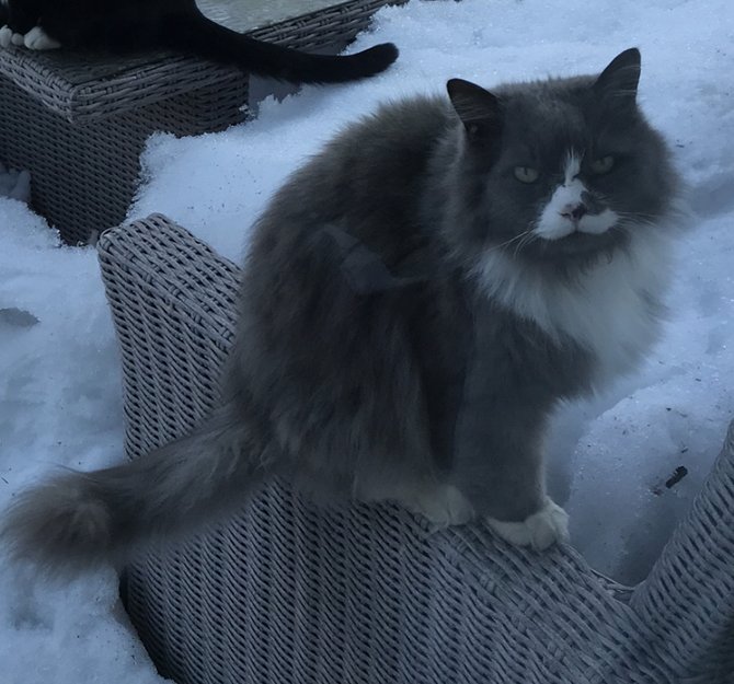 Han har en grå, distinktiv flekk ved siden av snuten. Sosial. Veldig hjemmekjær og er aldri borte mer enn en dag. Han er chippet.
