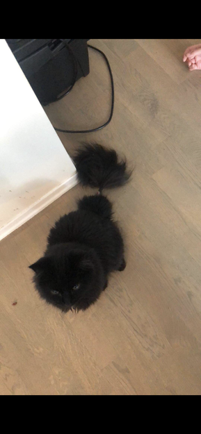 På fredag. Hun er sort og langhåret, halen er delvis barbert og hun har på et rødt halsbånd.