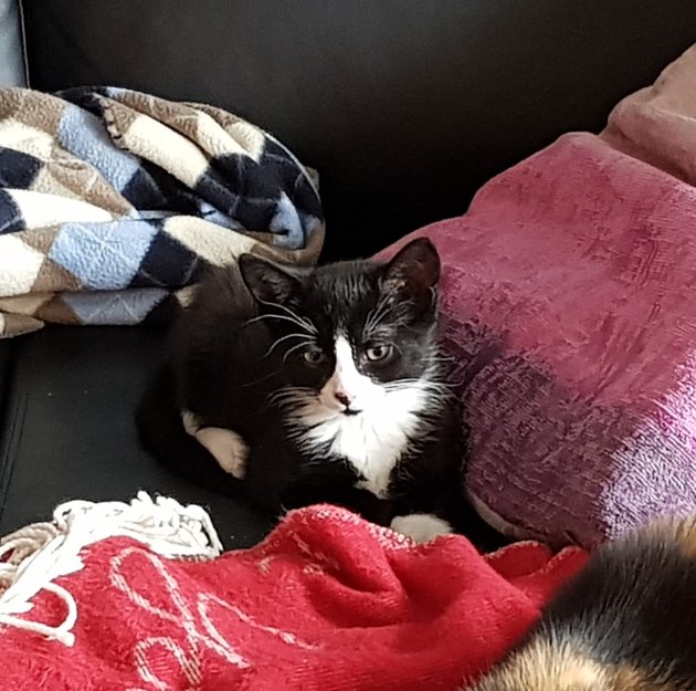 Katten er sort med hvitt på alle labber og under på brystet og magen. Hvit rundt snutepartiet, men en sort flekk på nesa og underkjeven.