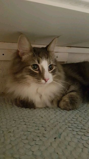 Langhåret katt, med lys grå pels og noe hvitt i ansiktet. Hvite sokker på alle fire ben, i tillegg til bittelitt hvitt på haletuppen. Rødt halsbånd med en liten bjelle.