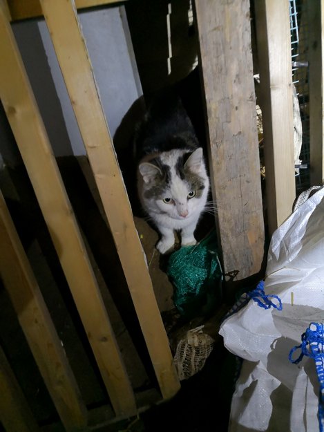 Katten oppsøkte huset og spiste fuglemat ifra bakken. Har nå flyttet inn i en pallehaug i uthuset. Tam og kosete. Ingen chip. Bør få komme hjem.