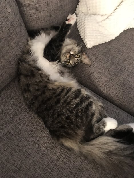 Er tigerstripet, ekstremt kosete og snill. Prater mye. Noen av «fingrene» på poten er sorte og noen rosa.