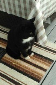 Sort stor korthåret hannkatt med litt hvit på bringa, hals, frampoter og hvite værhår
