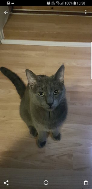 Grå liten hannkatt. Kastrert og id merket i ørene.
