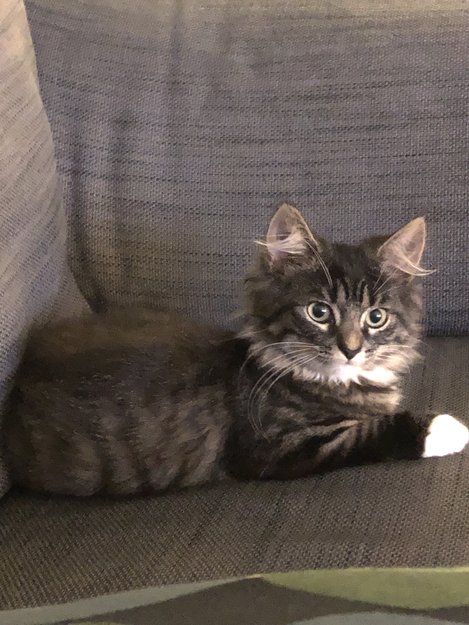 Small cat 5 months old, black stripes white paws dark grey with brown. Sweet, skitich. Her name is Tar