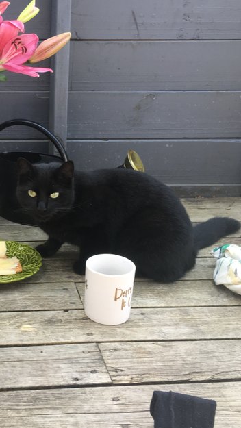 Korthåret, sort hunnkatt. Litt liten av vekst, to år gammel og litt folkesky.