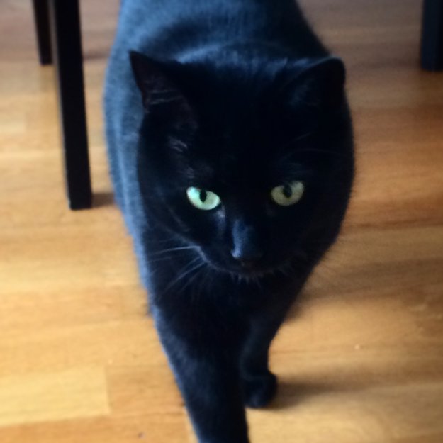 Hun er så og si helt svart, har bittelitt hvite hår på brystet. Mellomstor, ganske sky men kan «snakke» en del.