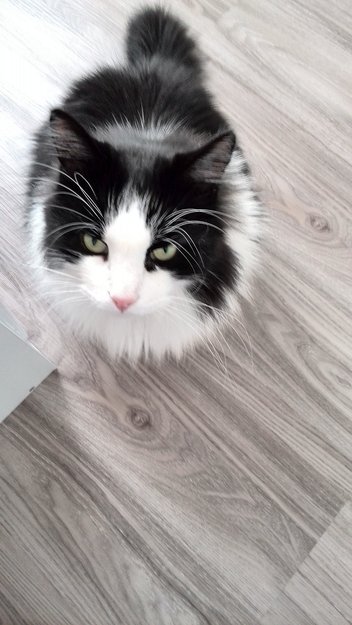 Brun/sort og hvit pels. Engstelig/ganske redd fremmede.