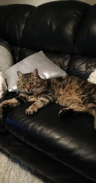 Katten har halvlang blank og fin pels i mørke brune og sorte ringer/tiger striper. Han er veldig kjælen, tillitsfull, skravler(mjauer) mye og er i fin stand. Han er mørk brun på nesen, og er kun hvit under haken. Det antas at han er ca 4år og han er kastrert, men ikke chippet.