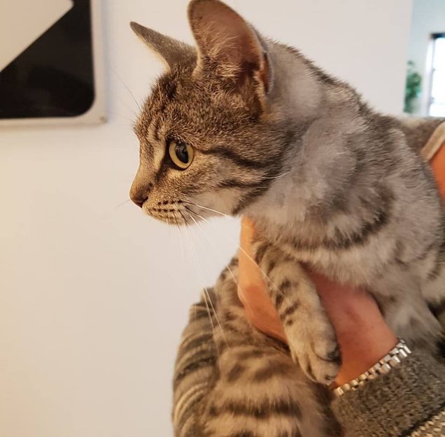 Grå spraglete, korthåret. Tam og kontaktsøkende.
