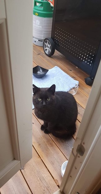 Svart katt, med hull i det ene øret. Skvetten og liker å spise uten tilsyn. Hvis ikke tar han maten i munnen og løper ett stykke unna for så sette maten på gulvet og spiser det.