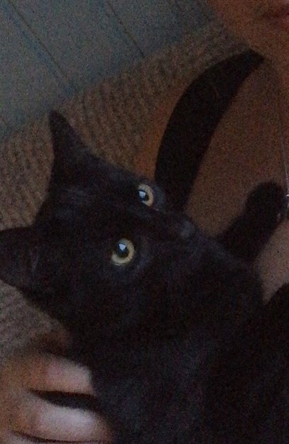 Helt sort, kan skimte striper i pelsen, 3-4 hvite hår på brystet.