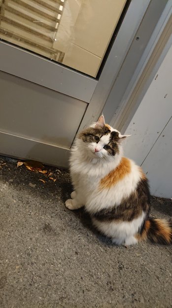Denne katten er mye utenfor blokka på Lademoen, den vil inn der men tror ikke den hører til der ettersom den bare sirt utenfor dører til tilfeldige og det ikke er lov med dyr i den blokka, håpe eier finnes. Katten er veldig mye ute.