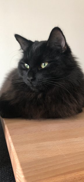 Taco er en stor hannkatt, ca 6 kg. Lang, svart pels. Han har øretatovering. Han er chippet og kastrert, men chippen er ikke registrert på oss. Blitt barbert på brystet for et par måneder siden, så har fortsatt ganske kort pels der. Kan være litt sky, skeptisk til fremmede.