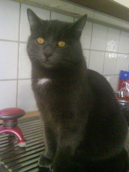 Manni er en 3 år gammel kastrert katt, har en hvit flekk på brystet. Korthåret og veldig spesiell grå. Kosete og snill, litt redd av seg