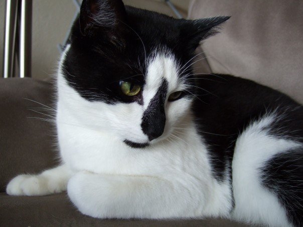 Reagerer på navnet pus! Har i tillegg en bjelle på halsbåndet som man hører lett. Nysgjerrig type. Menneskekjær og kosete.
