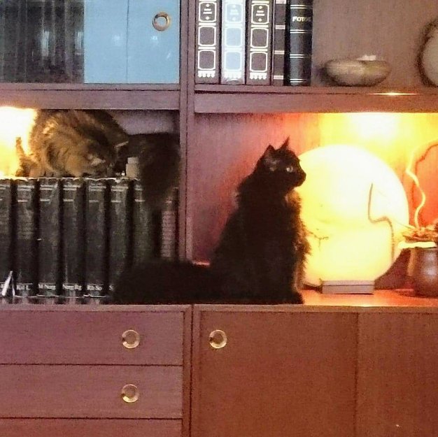 Helt svart og langhåret. Har en grønn kant rundt iris, ellers gule øyner. 9 måneder, så er ikke fult utvokst.
