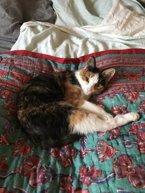 Ett år gammel, men ganske liten for alderen. Tricolor med brun/rød, hvit og svart pels. Ganske sky rundt fremmede og liker ikke å bli løftet