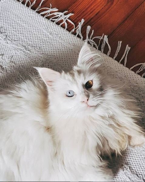 Tufter på ørene, ett blått og ett gult øye. Veier ca 5 kg, lang pels.