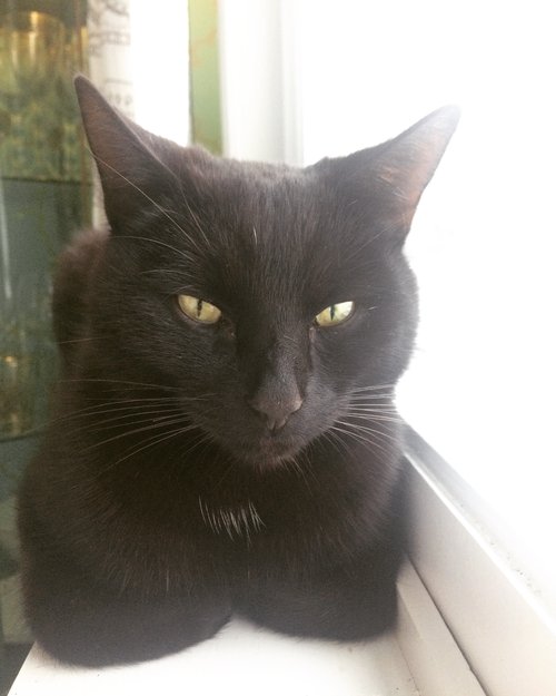 Helt svart katt, men litt hvitt på halsen og ett og annet hvitt hår innimellom.