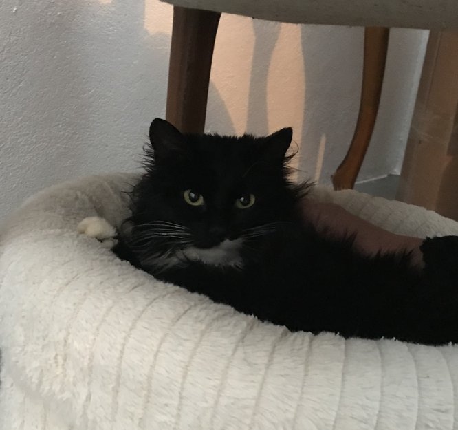 Funnet i Øst Brumund. Holdt seg utenfor en ukes tid før den ble fanget. Litt sky, men tydelig vant til mennesker. Bærer preg av å ha vært ute en stund. Ikke chippet.