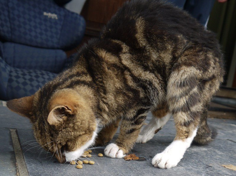 Skrøpelig og pjuskete, svært tynn. Den virker gammel, giktisk med dårlig hørsel og syn? Veldig tørst, det kan jo tyde på nyreproblemer. "Mange farger" i pelsen, hvite poter og litt hvitt ved snute og på halsen. Veldig tillitsfull.