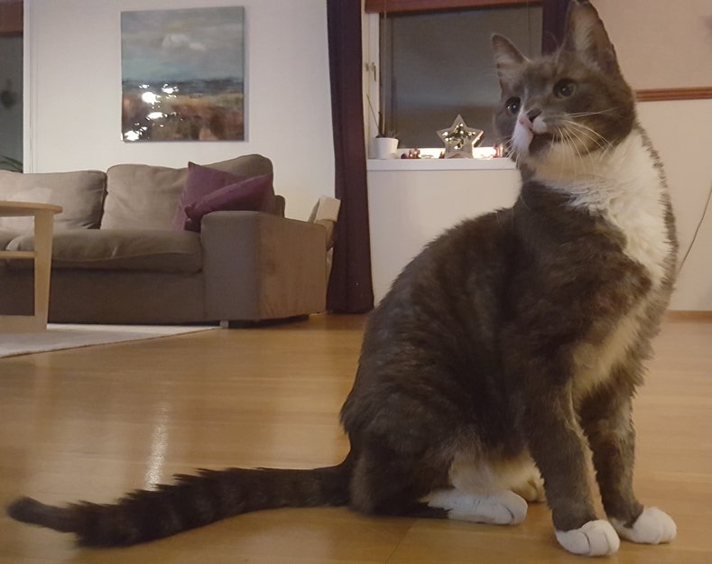 For halvannen måned siden fikk vi han hjem. Da hadde han vært borte nesten 7 uker, og var sterkt avmagret (fra 8 til 3,2kg) og ble funnet ved Skjetlein VGS. Vi har nå foret ham opp til litt over 5kg, men han ser fremdeles litt tynn ut ved bakbeina.