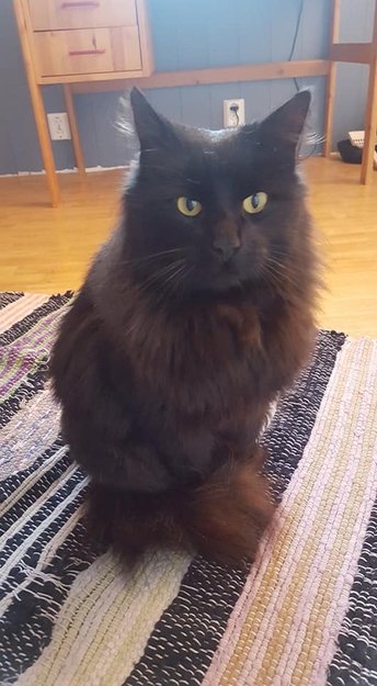 Han har solid svart pels. Semi langhåret. Noe brunt på haletippen .