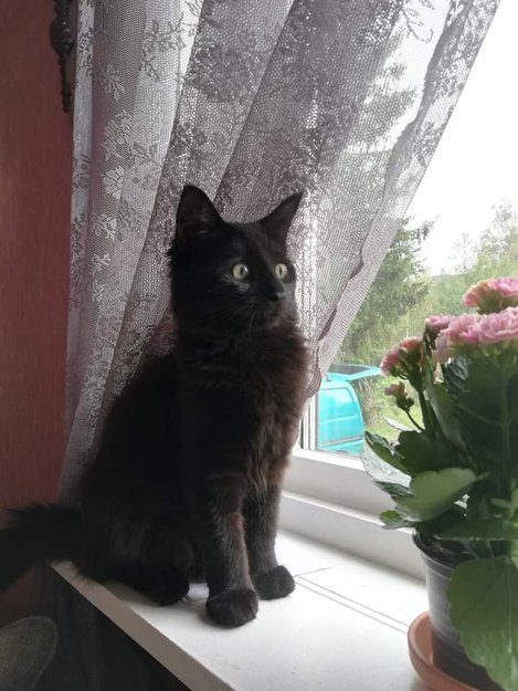 Hun er svart med brunlig nyanser i noen lys vinkler. 8 måneder gammel, Utrolig deilig silke myk pels.