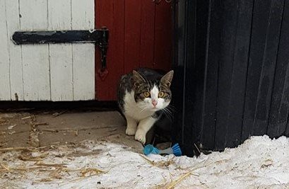 Den dukket opp på småbruket mitt. Da det er mange katter i omegn tok det noen dager før jeg forsto den var hjemløs. Da den åpnet dunker med brød og spiste kastet hønemat begynte jeg å mate den. Håper noen savner den!