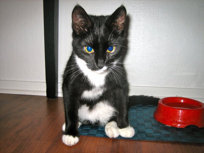 Veldig kjælen og tillittsfull. Svart og hvit. Er hvit på brystet/ halsen og litt på ene siden i ansiktet. Er også hvit på potene.