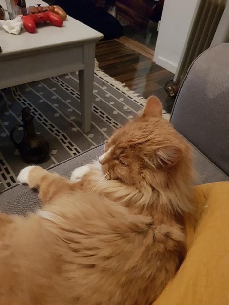 Katta kom ruslende hjem for litt siden, etter å ha vært sporløst borte i to uker. Han er ekstra bustete, men i fin form, så jeg mistenker at noen har drevet og matet han og holdt han inne hos seg.