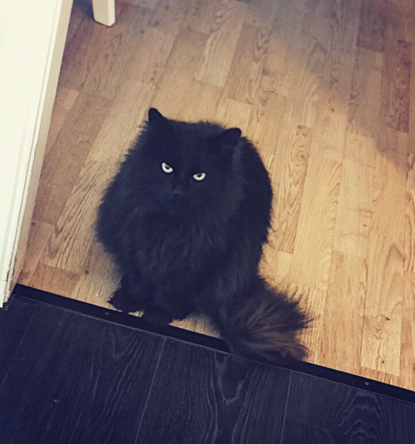 Helt svart. Lyder navnet Mo godt, litt skeptisk til fremmede. Litt brunaktig i tuppene på pelsen og halen. Halsen ser knekt ut da den ofte ligger helt skeivt oppover ryggen, den er ikke det. Han har også helt gule øyne.