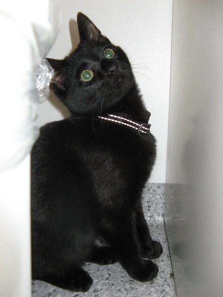 har et lite svart reflekshalsbånd med bjelle, veldig kosete
